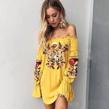 Model Number: Off Shoulder Floral embroidery long flare sleeve Mini Dress